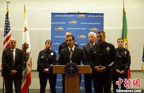 图为洛杉矶市长安东尼奥·维拉莱戈萨和洛杉矶警察局局长查理·贝克在新闻发布会上联合宣布,警方当地时间下午4点和晚上7点分别抓获两名嫌犯。