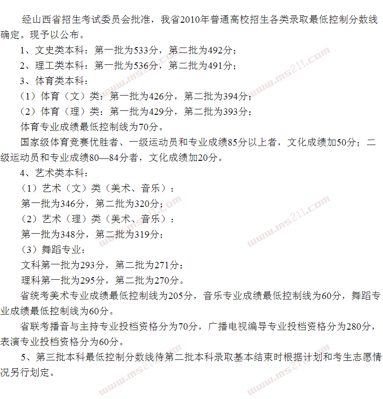2012年山西省普通高校招生考试评卷、成绩合成等工作已圆满结束,成绩于25日揭晓。现将山西省招生考试委员会批准划定的普通高校招生各类录取最低控制分数线(不含二批本科C类院校)及有关事项予以公布。