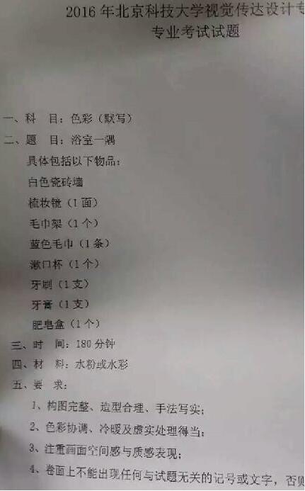 北京科技大学2016年面向北京、河北、河南、山西、山东、内蒙古、辽宁、吉林湖南招收视觉传达设计专业(艺术类)学生40人;专业考试成绩满分为750分,其中素描满分300分、色彩满分300分、速写满分150分。考试科目安排:上午考色彩,下午考速写、素描。