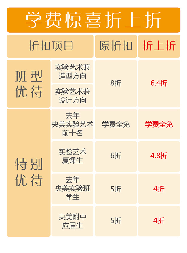 凡参与体验课活动的学员,如决定报名央美实验班,可享受原有折扣基础上再打8折的年度终极优惠!超低折扣全学年仅此一波。