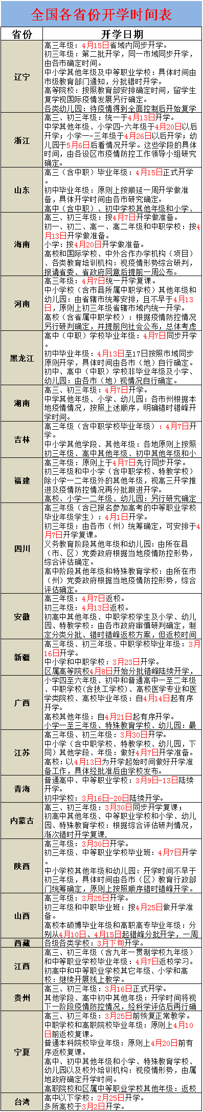 随着国内疫情好转,各地学生逐渐开学复课。4月3日,又有浙江、山东、辽宁三省份发布公告,分别明确开学时间。新京报记者统计,截至4月3