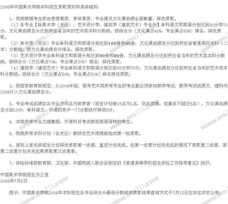 2006年中国美术学院美术高考录取分数线