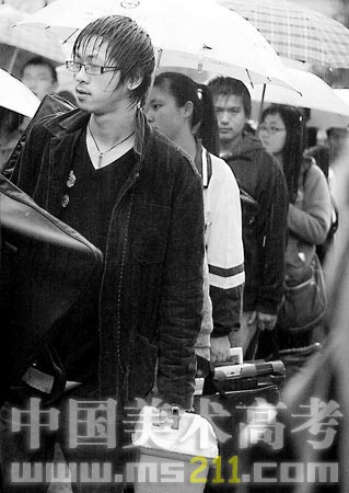 早报讯 昨天,为期3天的2007年中国美院杭州考点招生考试在风雨中开考。今年,中国美术学院杭州考点计划招收1600人,共有3万多名学子报名。昨天是专业课开考的第一天,由于冷空气来袭,杭州气温骤降,并从早上7点开始便下起大雨。于是,冒着雨、喝着姜汤、提着大包小包排队赶考的学生流,成为昨日中国美院南山校区的独特风景。