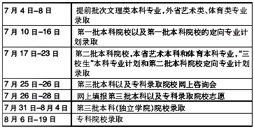 本报南昌讯 记者黄小路报道:记者昨日从江西省高招办获悉,今年我省高招各批次录取的具体时间已经敲定,录取工作从7月4日开始,8月19日结束。今年分为提前本科、一本、二本、三本、专科(高职)批次,每批次按一志愿、二志愿首次及二次进行投档。