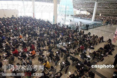 2月5日上午8点整,山东省2009年艺术类考生艺术专业考试正式拉开帷幕。山东工艺美术学院由于考生人数众多,将考场搬进了20000余平方米的济南市舜耕会展中心,让近7000多名美术类专业考生在展厅内同时参加考试,一展身手。