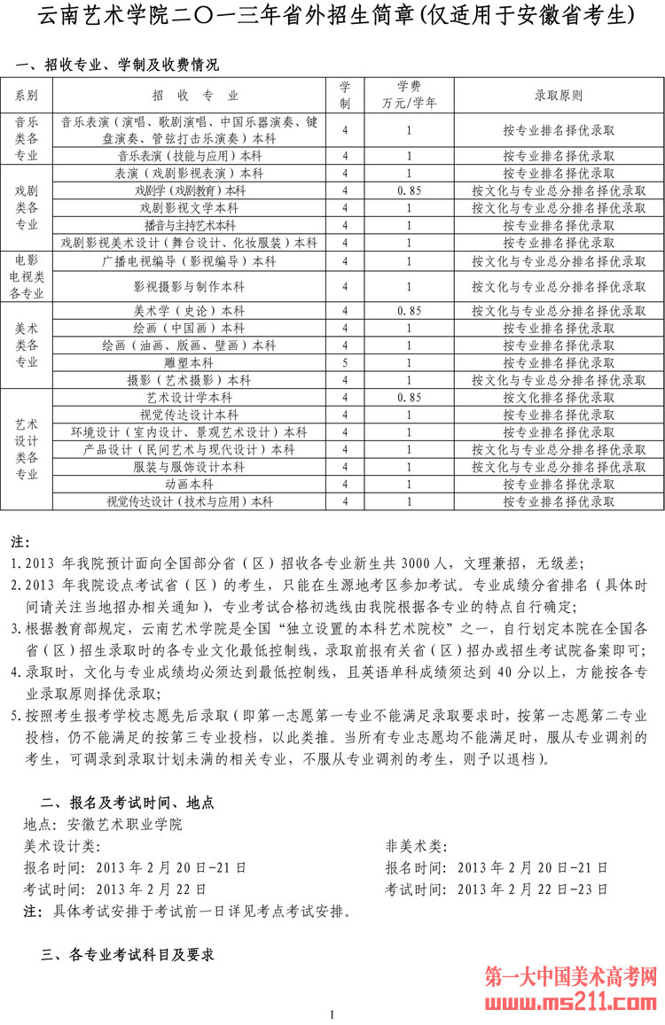 云南艺术学院2013年省外招生简章(安徽)