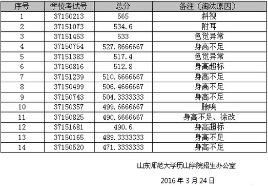 山东师范大学历山学院2016年舞蹈学(校企合作)专业体检不合格名单公示