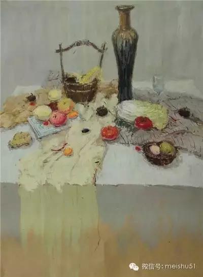 需要提醒大家的是,用笔要稳健中求灵活,不要浮躁也不要死板。笔触可大大小,最好不要一律用同样大的笔触,笔触的方向可以顺着物体的结构转换,例如水果蔬菜器皿的笔触要小一些,而后面的衬布最好笔触大一些,这样才能更好的突出主要的物象,在画面上形成简与繁的对比。