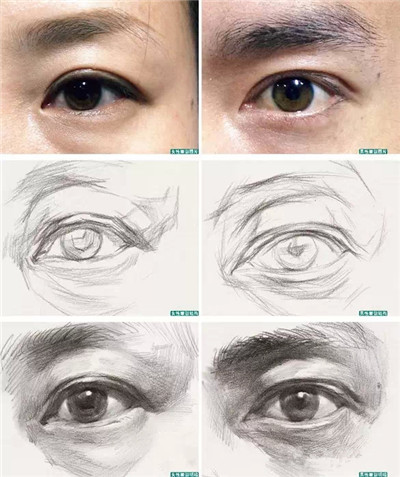 1 . 上下眼皮是附着在眼球上的, 一定要画出上下眼皮包裹着眼球的感觉。 2 . 上眼皮在下眼皮上的投影不能忽视, 并且投影形状的方圆、虚实、深浅等变化也要交代清楚。