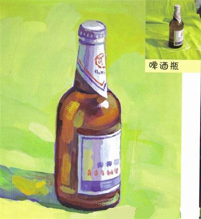 啤酒瓶一般有绿色和棕色两种。瓶子的颜色较深,两侧壁较厚,透明度此玻璃杯差一些,作画时应认真观察瓶子色相与色调的变化,一般来说瓶子的两侧色相较深,中间色相较浅,因而两侧用纯度较低的色彩表现,中间用纯度较高的色彩表现。用笔要干脆利落,干湿适中,少用于笔或干擦的笔触。