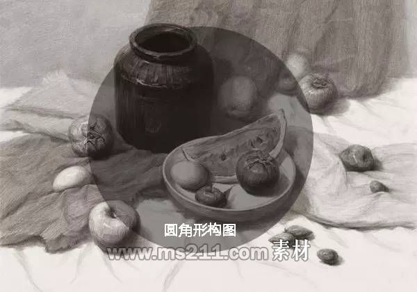 圆形构图就是让静物在画面中围成一个圆圈。圆形构图在视觉上给人以旋转、运动和收缩的审美效果。当圆形被拉长时,就会变成椭圆形。椭圆形构图大都采用宽大于高的横幅形式,它不仅有静态效果,也会产生动态效果,同时还具有较为明显的整体感。