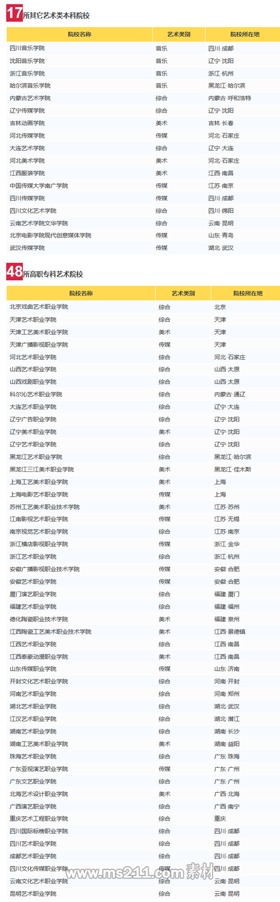 以下院校均为教育部合法计划招生,供艺术类考生参考。未出现在表单上的院校,例如北京现代音乐学院、北京演艺专修学院等不具备招生及颁发学历的知名野鸡院校,大家要睁大眼睛避免上当受骗。