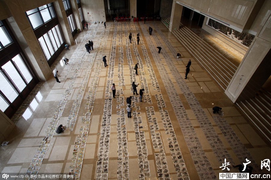 阅卷现场,一幅幅考试画卷铺满了大厅,评委老师手拿长棍在画面上指指点点,认真判卷。