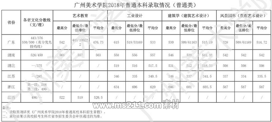 (1)工业设计、建筑学、风景园林专业在江苏、浙江、湖南、湖北四省招收普通类理科生。艺术教育专业在湖南、江西两省招收普通类文科生。其它美术类各专业文理兼招。