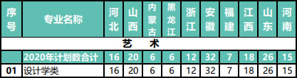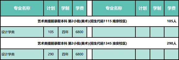 备注:淮安校区设计学类含视觉传达设计、环境设计、环境设计(室内设计)、产品设计等4个专业,仅面向江苏省招生,采用“2+2”培养模式:一、二年级学生在淮安校区学习,三、四年级学生在南京校区学习。。南京校区设计学类含视觉传达设计、环境设计、环境设计(室内设计)、公共艺术、数字媒体艺术、产品设计等6个专业。
