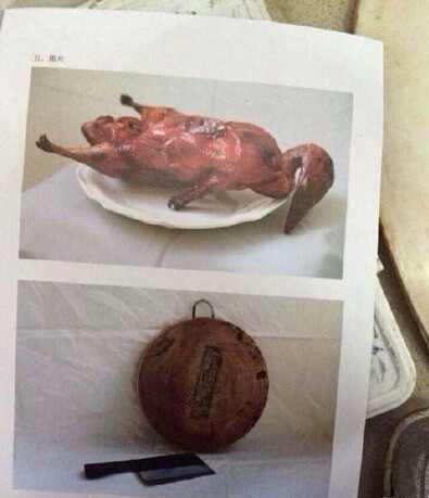 色彩考题:图片:烧鸭 白盘 砧板 菜刀; 默写内容:1棵白菜,3个蒜头,2个红辣椒,2个绿辣椒,1块白色衬布,1块暖灰色衬布。