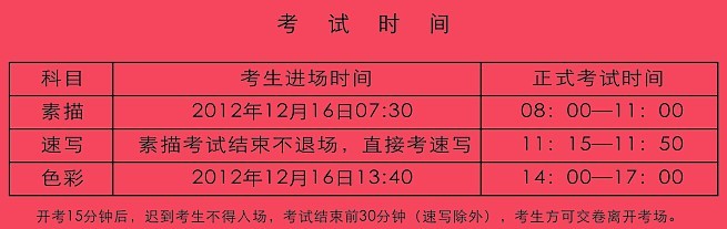 3.请于2012年12月16日上午7:30前,携带本人二代《身份证》、《准考证》及画具准时到所在考场参加考试。