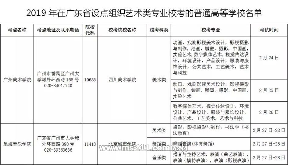根据《教育部办公厅关于做好2019年普通高等学校部分特殊类型招生工作的通知》(教学厅〔2018〕13号)和《关于全面启动全国艺术类专业招生考试信息交互系统的通知》(教学司〔2018〕9号)(下称《通知》)精神,以及我省《关于印发广东省2019年普通高校艺术类专业考生招生办法的通知》(粤招办普〔2018〕62号)的工作要求,现将在我省8个校考考点组织艺术类专业校考的普通高等学校名单、校考科类、校考专业及考试时间汇总公布(附件,报考广州美术学院校考专业考试的考生所在考点安排详见广州美术学院招生办网站)。拟报考未在我省考点组织校考的普通高校的考生,要密切留意该校网站,及时了解该校艺术类专业校考的报名和考试的时间、地点及相关要求,并按该校的规定依时参加考试。