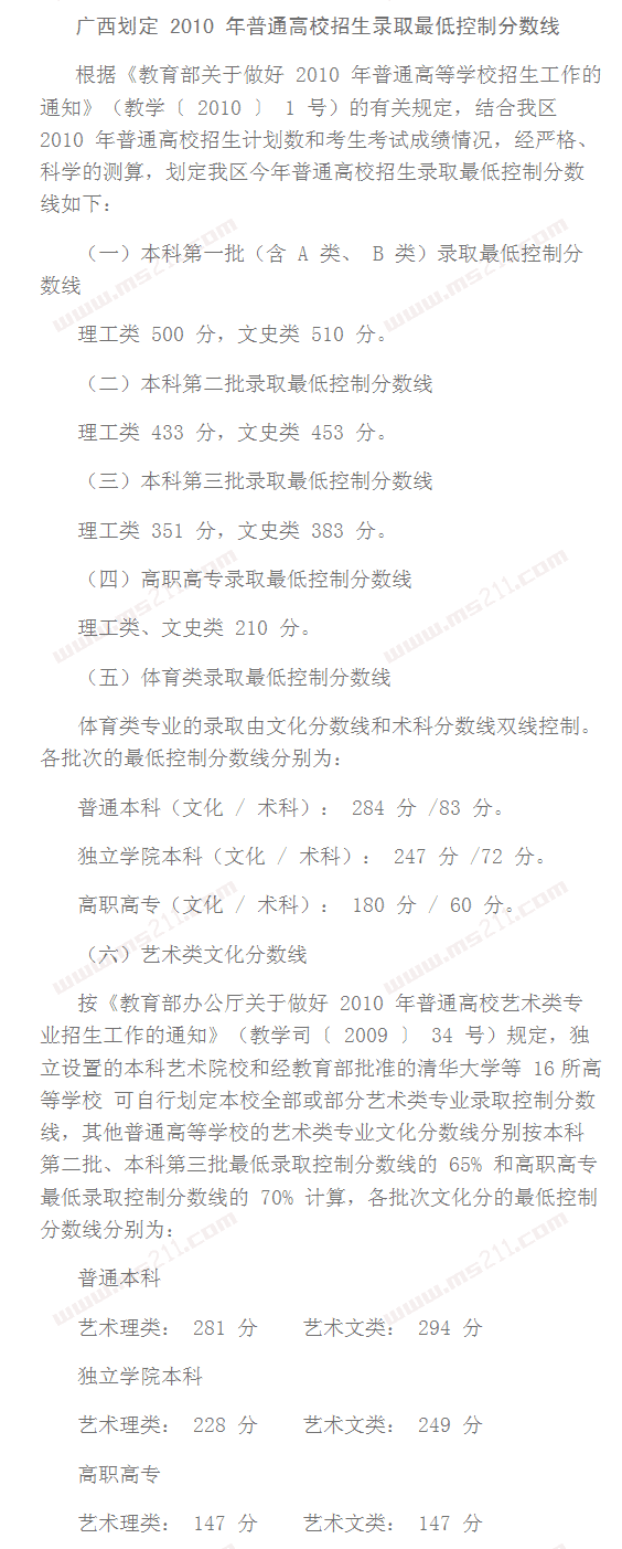 根据教育部关于普通高等学校招生工作的有关规定,结合我区 2012 年普通高校招生计划数和考生考试成绩情况,经过严格、科学的测算,我区今年普通高校招生录取最低控制分数线划定如下: