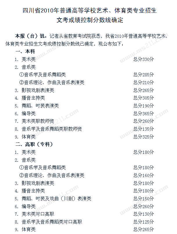 2010年四川高考录取分数线(含美术)