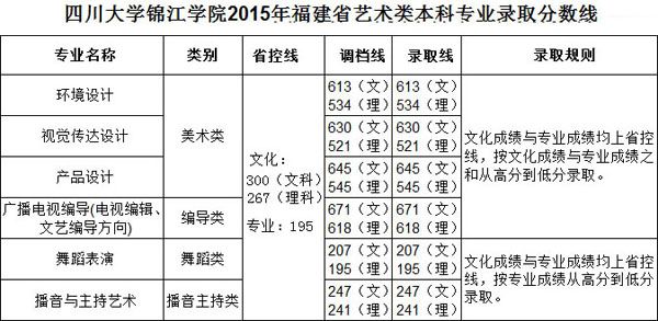3、录取时,在文化成绩达到考生所在省(自治区、直辖市)招生行政主管部门划定的本科分数线的前提下,舞蹈表演、播音与主持艺术专业按专业成绩由高分到低分择优录取;美术与设计类专业按文化成绩与专业成绩之和由高分到低分择优录取,总分相同时优先录取文化成绩较高的考生;广播电视编导专业四川省按文化成绩由高分到低分择优录取。其它省份按文化成绩与专业成绩之和由高分到低分择优录取,总分相同时优先录取文化成绩较高的考生。