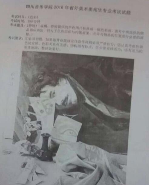 四川音乐学院2016年美术校考考题(安徽考点) 考点信息:安徽考点 素描考题:照片外国人。 速写考题:三个动态要求三个人都必须单腿支撑做不同的动态。 色彩考题: