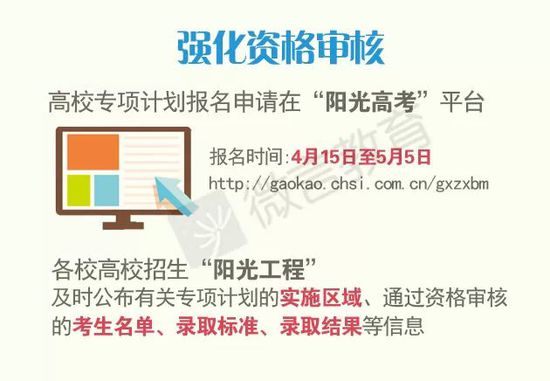 各地各校要深入实施高校招生“阳光工程”,及时公布有关专项计划的实施区域、通过资格审核的考生名单、录取标准、录取结果等信息,主动接受社会监督。对违规违纪行为,将依法依规严肃处理。
