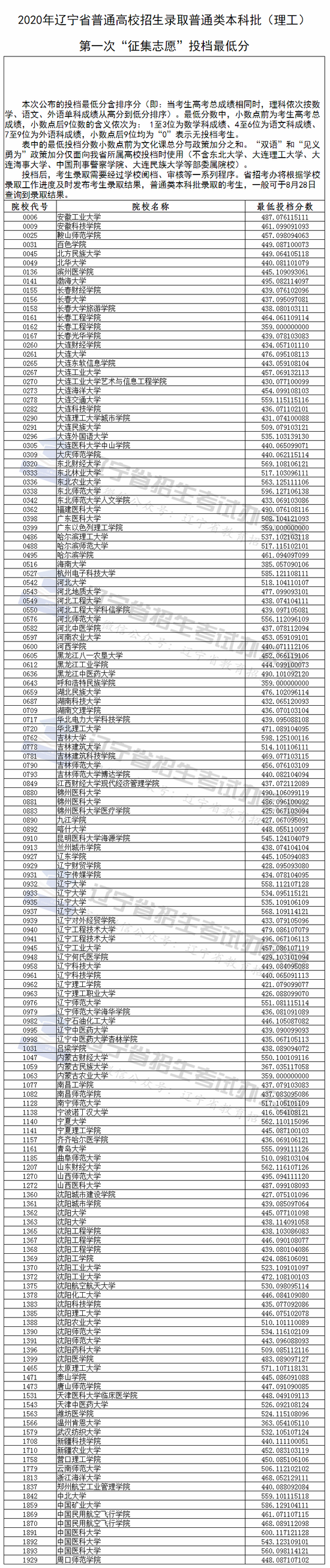 辽宁录取普通类本科批第一次"征集志愿"投档最低分